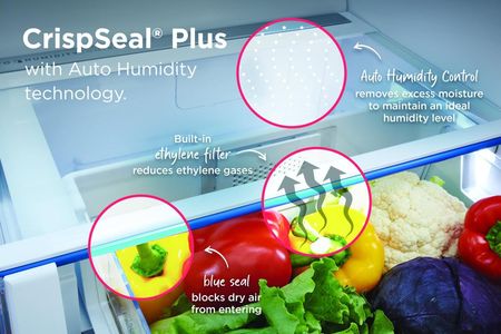 Help prevent produce from spoiling: advanced CrispSeal® Plus Crispers with Auto Humidity technology automatically removes excess moisture plus an added ethylene filter reduces the gas emitted by many fruits and vegetables that causes spoiling.