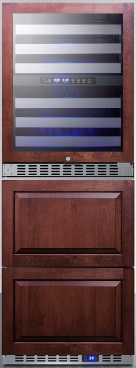 Sized at just under 24" wide, the SWCDAR24PNR combines the 46 bottle capacity two-zone wine cellar (model ALWC532)with the 3.4 cu.ft. two-drawer refrigerator (model FF642D) into one complete refrigeration station. The front-breathing design allows built-in installation, while the stainless steel cabinet affords freestanding use in a durable design. The sealed back offers added space savings when placing the unit, while the included 6' Y-shaped NEMA 5-15P cord with a 3-prong right angle plug allows users to operate both units from one outlet without added depth. The wine cellar door frame and refrigerator drawer fronts can be customized with overlay panels to match or accent an existing cabinetry design. Users provide their own handles to complete the look. An anti-tip bracket is included and recommended for use to avoid forward tipping. For user convenience, this model ships fully assembled.