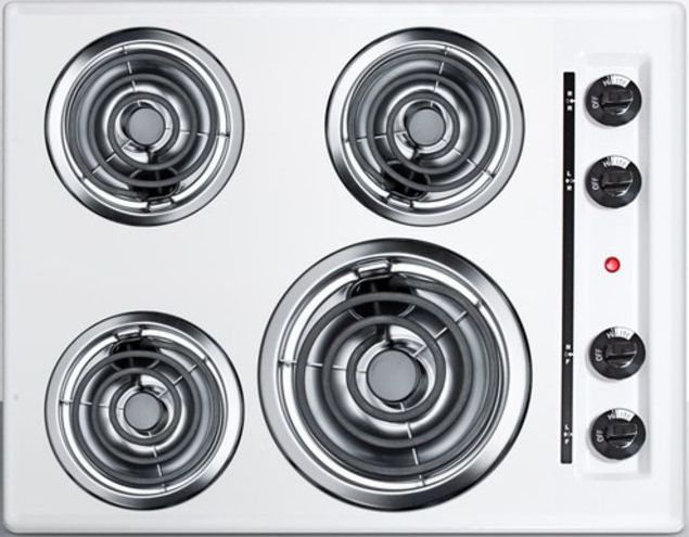 The WEL03 is a 24" wide cooktop with a scratch resistant porcelain surface in white. It features one 8" and three 6" coil elements, all with chrome drip bowls. A recessed top helps to contain spills.Read More