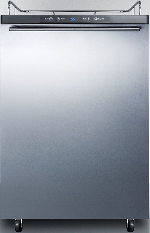 Summit Appliance offers a versatile line of full-sized freestanding beer dispensers designed for low maintenance storage in the style of your choice. The SBC635MNKSSHH features a large interior that can hold a full half, quarter, 0.17" or mini keg. No tapping equipment is included, allowing 'do-it-yourselfers' to customize the unit with their own system. It comes with a black cabinet and stainless steel wrapped door complete with thin handle mounted horizontally for a sleek, modern look. The surface includes a removable drip tray to collect spills and a chrome guard rail to help keep glasses and mugs in place. We include a set of locking casters for easy mobility. Automatic defrost operation ensures minimum user maintenance inside the 5.6 cu.ft. interior. A digital thermostat makes it easy to manage the temperature at the touch of a button. The external digital display shows the temperature in Celsius or Fahrenheit to ensure your beer is stored exactly how you like it. The floor is reinforced with a steel cover for added durability when loading kegs. This unit is designed for freestanding use. For built-in applications, see the SBC635MBINKSSHH.